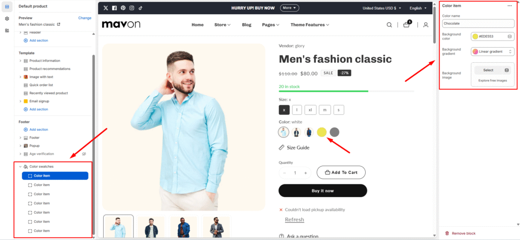 Configure custom color swatches for product variants to display visually accurate color representations when standard color names aren’t recognized by the browser.