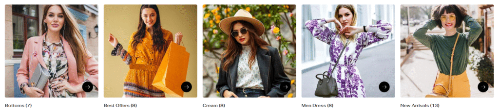 Card settings | Choose how content appears on collection cards: Standard – Basic card layout Content inside with overlay – Text overlaid on collection image Content inside with button – Text and button overlaid on image Image ratio: ————- Adapt to image – Uses collection image’s natural aspect ratio (cropped) Portrait – 2:3 cropping ratio for taller images Square – 1:1 cropping ratio for square images Circle – Images cropped to 100% rounded circles Round corners – Enable rounded corners for collection images Show zoom on hover – Enable/disable image zoom effect on mouse hover Show product count – Display number of products in each collection Show arrow button – Toggle visibility of navigation arrows Button Style: ————- Secondary – Outlined button style Primary – Filled button style Button Size: ————– Large – Bigger button for emphasis Medium – Standard button size Small – Compact button size Card color scheme: card color scheme for every card. |