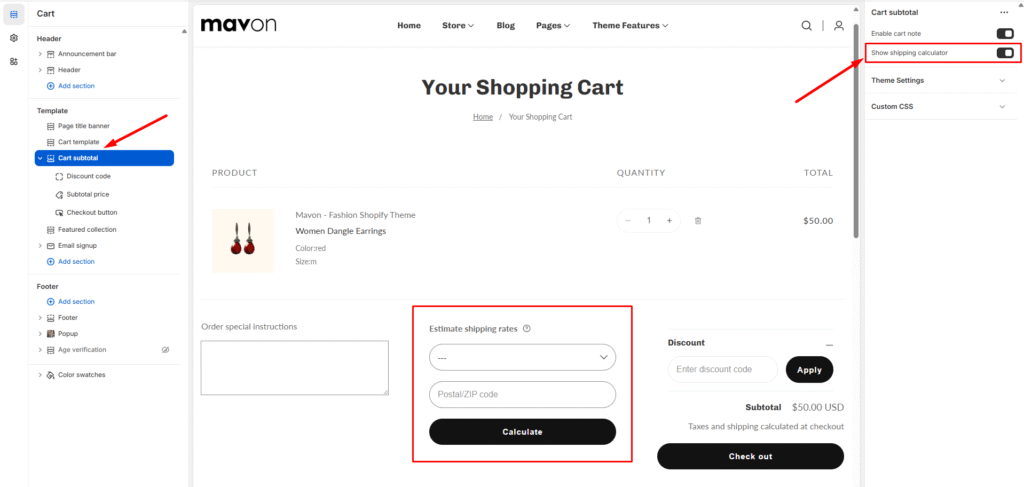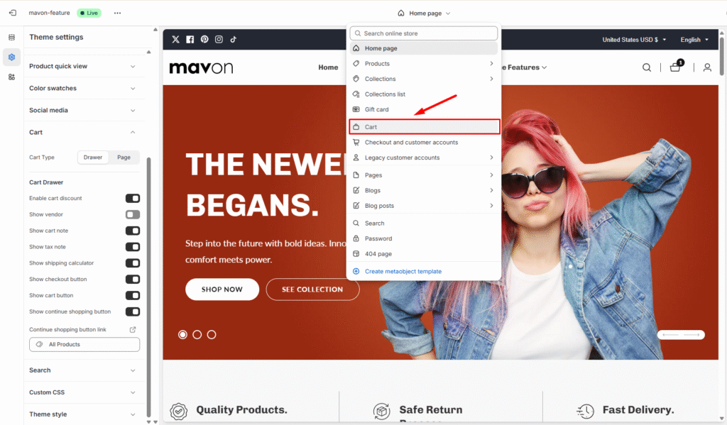 - Click on the top navigation bar and select Cart to open the Cart page template.