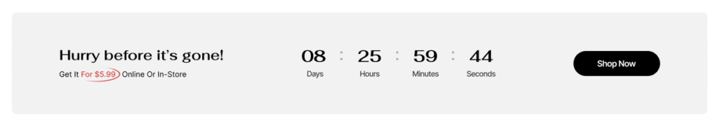 Heading | Configure the main promotional heading: Content Settings: ——————— Caption – Optional text above heading Heading – Main promotional text (e.g., “Hurry before it’s gone!”) Subheading – Additional promotional text (e.g., “Get it for $5.99 Online or In-Store”) Text Styling: ————— Text style – Subtitle or Uppercase options Heading size – Small, Medium, or Large Use bold style to emphasize or highlight text color Layout: ———— Content alignment – Left, Center, or Right alignment Mobile devices default to center alignment |