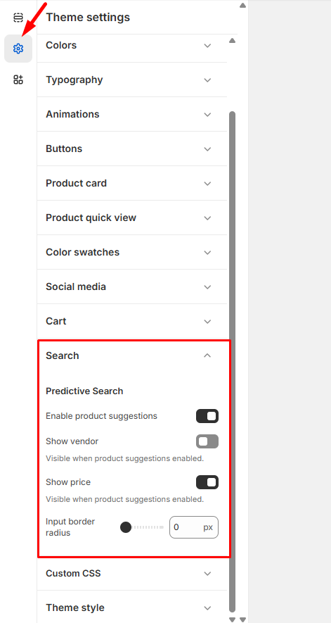 2. Find the theme that you want to edit, and then click Customize > Theme settings > Search.