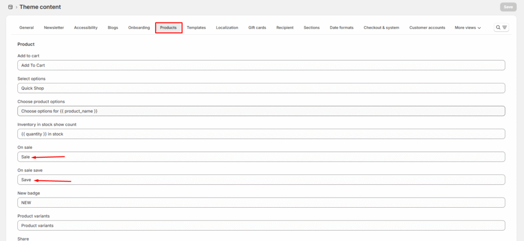To activate a sale badge display, you need to specify the original selling price & the after-discount price on Shopify. You can do as follows: