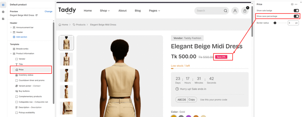 In the product’s configuration panel, you navigate to the Pricing section and insert the prices after and before the discount. Note that the original price must be in the Compare at price box, and the after-discount price is in the Price box to enable the sale badge.