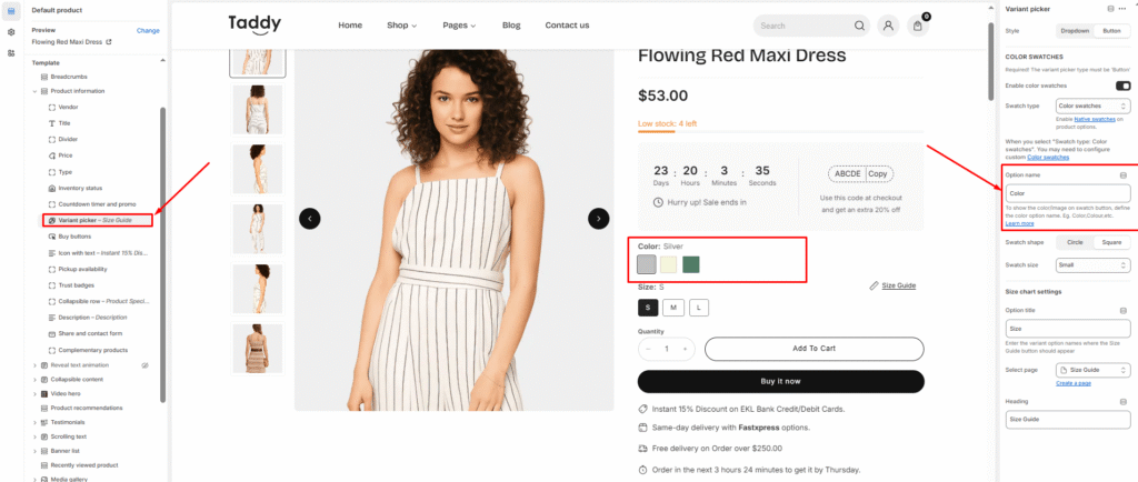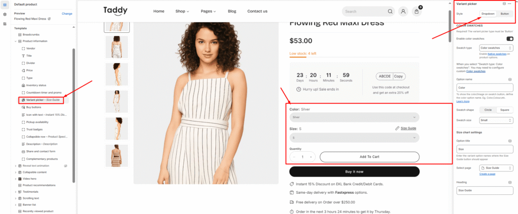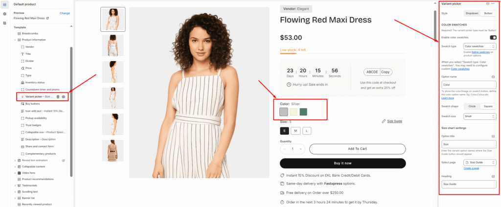 COLOR SWATCHESRequired! The variant picker type must be ‘Button’